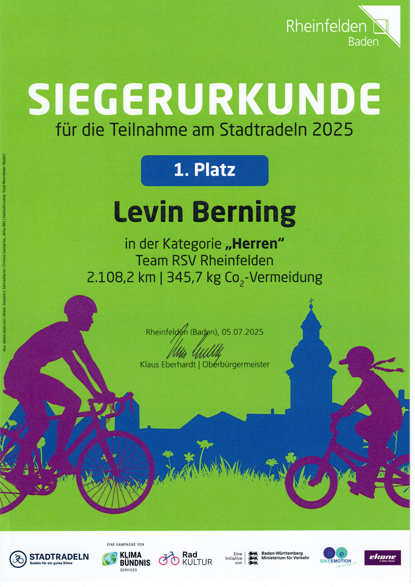 Am diesjährigen Stadtradeln haben leider nur sehr wenigen RSV Mitglieder teilgenommen. Unsere Gruppe bestand nur aus 8 Teilnehmern. Erstaunlich ist aber wieder einmal die Leistung unseres sehr talentierten Radspotler Levin Berning. Er hat mit 2108 Kilometer die Einzelwertung in Rheinfelden gewonnen. Zudem sind wir mit 732 km pro Kopf und nur 121 Ausfahrten 5854 Kilometer gefahren. Wir hoffen, dass wir im kommenden Jahr wieder mit mehr Sportlern mitwirken können.
